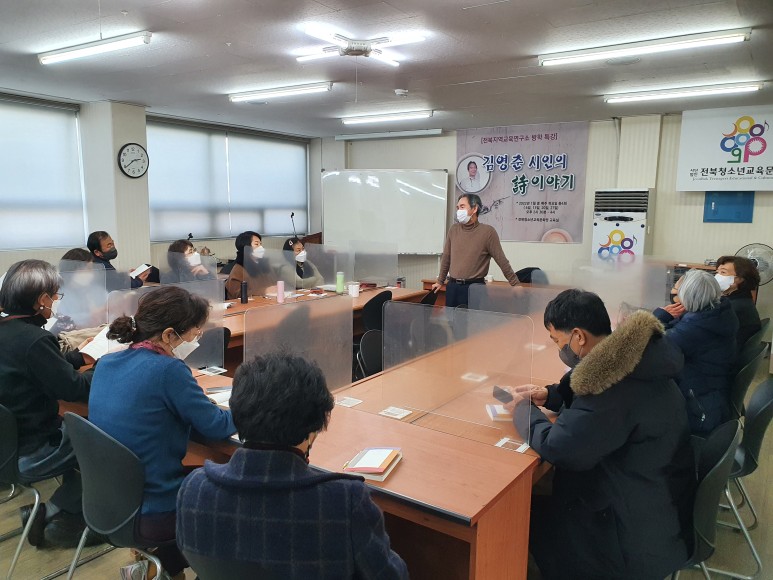 전북지역교육연구소는 2022년 새해를 맞이하여 시를 통하여 삶을 성찰하고 지혜를 얻고자 <김영춘시인의 '시'이야기> 특강(1월 매주 목요일, 4회)을 실시하였습니다. 이번 특강은 김영춘시인의 명강의로 매시간 참석자들에게 큰 울림과 감동을 준 자리였습니다.